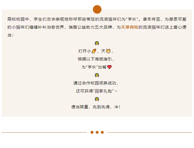 高校校园中,学生们总会亲昵地称呼那些常驻的流浪猫咪们为“学长”。凛冬将至,为感恩可爱的小猫咪们缝缝补补治愈世界,瑞鹏公益助力五大品牌,为天津高校的流浪猫咪们送上爱心便当